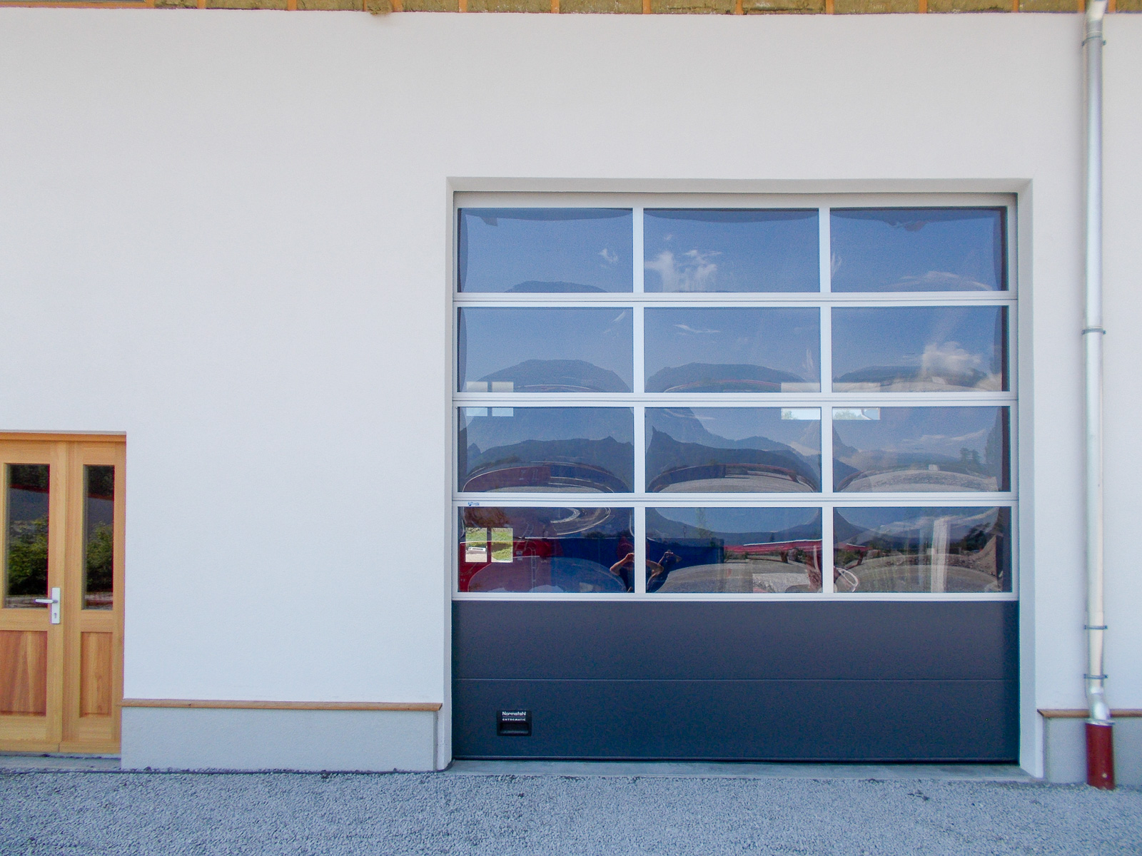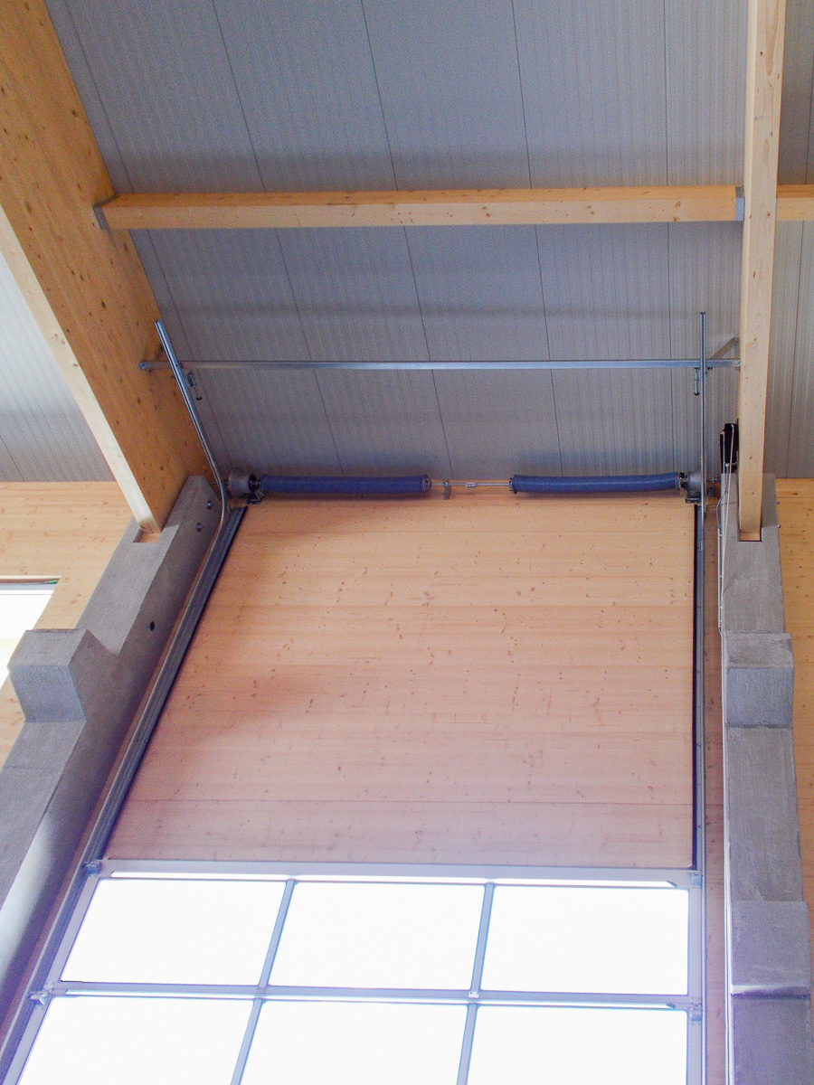Normstahl Industrie DST OSF 42 A mit zwei geschlossenen Sektionen in Antrazithgrau ähnlich RAL 7016, rest als Lichtbänder in Alu eloxiert,verglast mit kratzfestem Acryl – Isolierglas. Es wurden höhergeführte Laufschienen verbaut um die Tore möglichst weit nach oben zu bringen. Ein Impuls Antrieb mit Funk automatisieren die Tore.