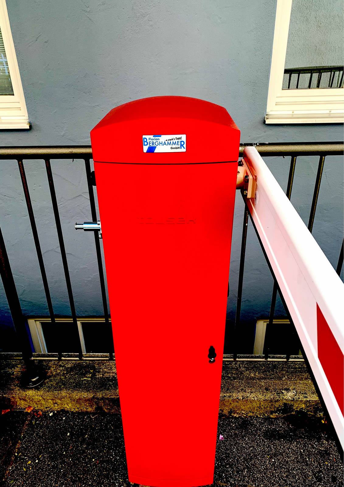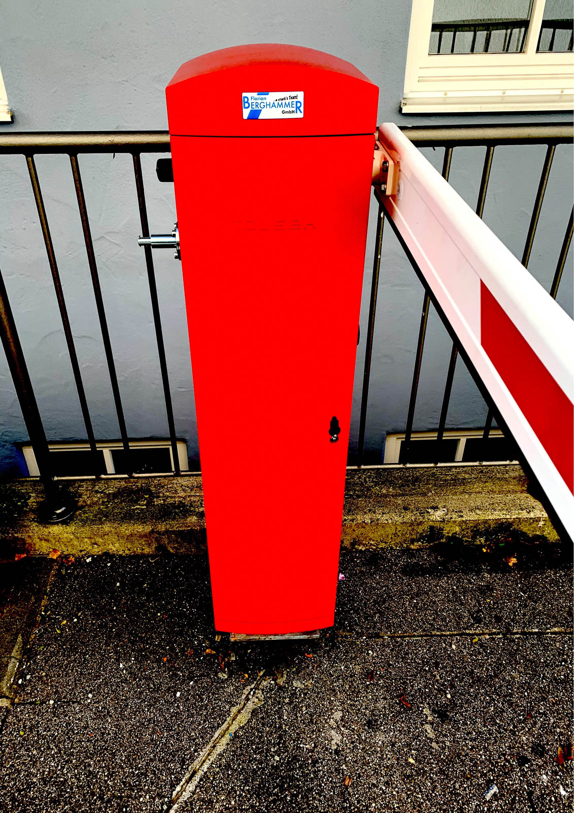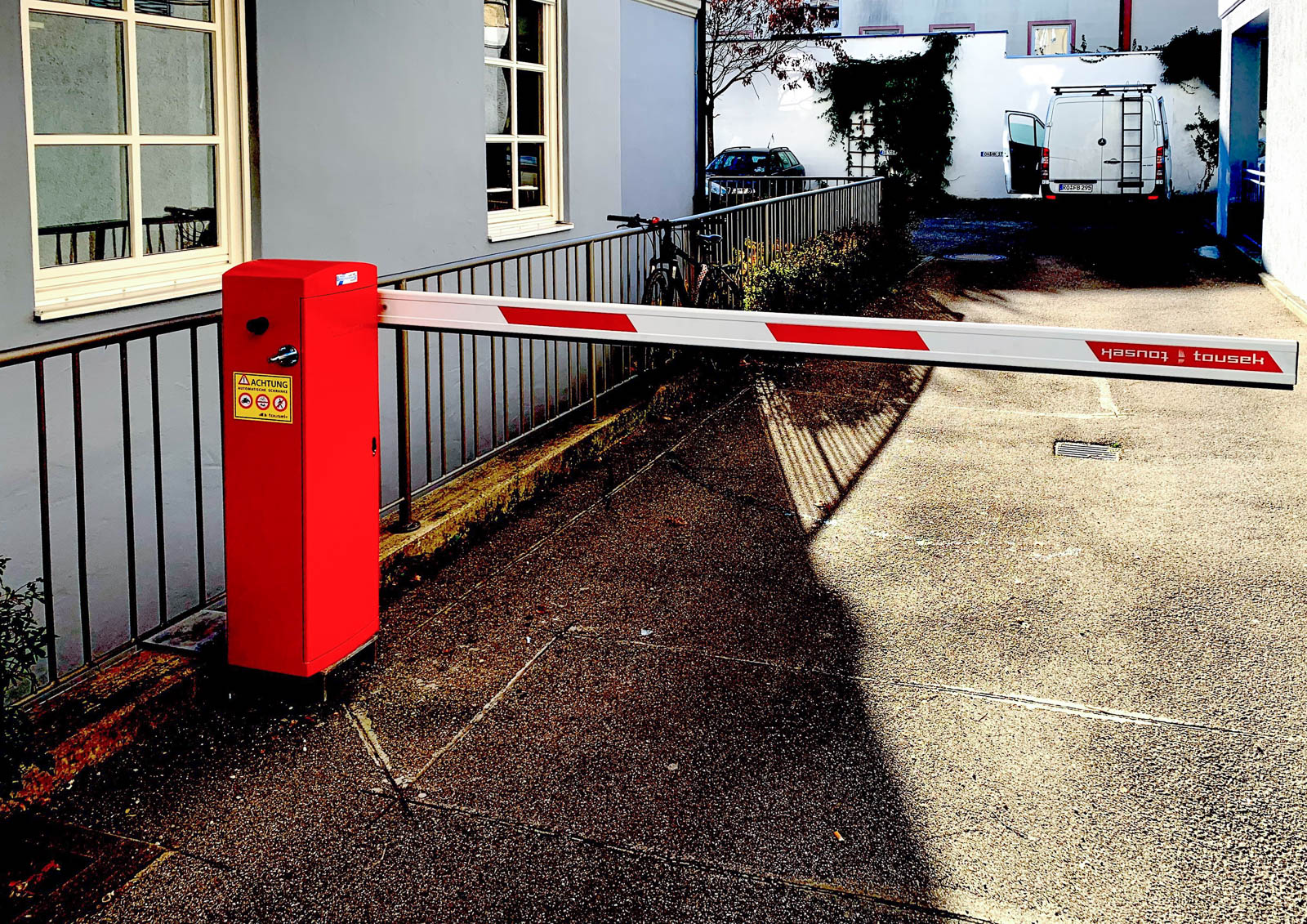 Tousek Schrankenanlage Pass 838 mit Extras - Standardfarbe rot, ähnlich RAL 3000 - Hohe Öffnungsgeschwindigkeit - Für Dauerbetrieb geeignet (100% ED) - Vandalismus sicheres Getriebe mit Zwangsschließung - Notentriegelung von außen möglich
